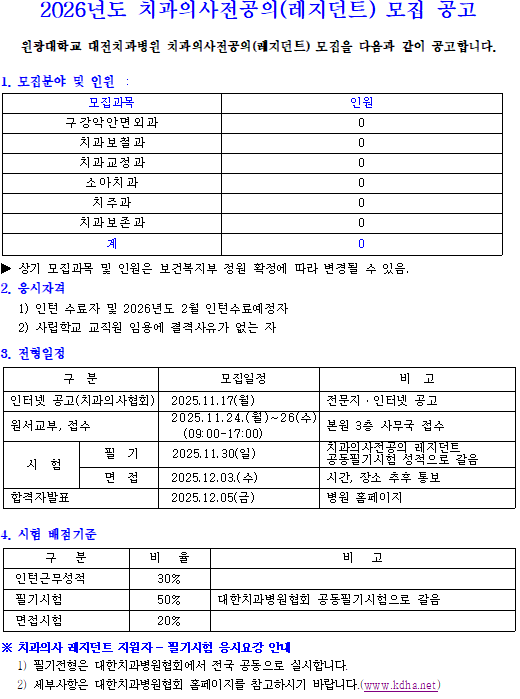 2026년도 치과의사전공의(레지던트) 모집 공고