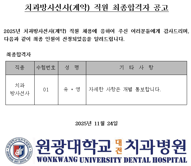 치과방사선사(계약) 최종합격자 공고