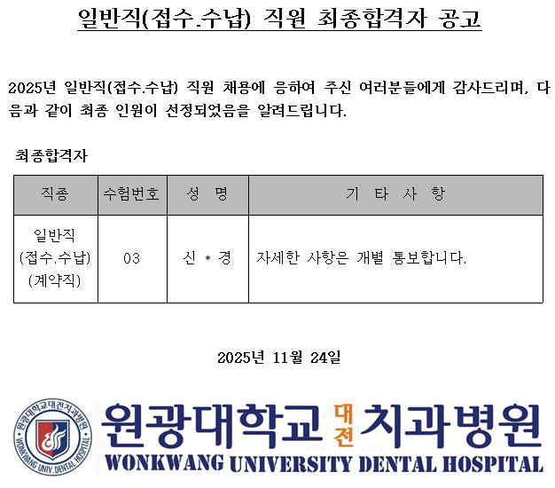 일반직 행정(접수.수납) 직원 최종합격자 공고
